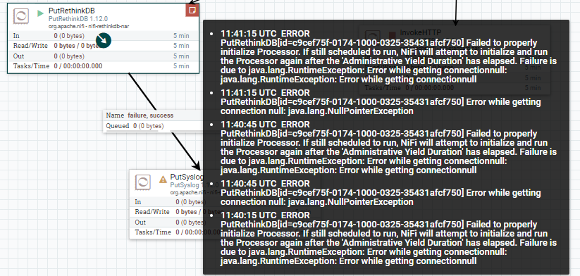 当我运行该流程时,PutRethinkDB处理器将显示以下错误。