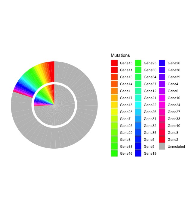 我想试着制作一个数字,就像一个马戏团的情节,一个圆圈有两个代表所有数据的圆环。内环为正常组织,外环为癌组织,每一节段均包含内环上的相关正常组织,外环上相应的癌组织。每个基因都有颜色编码,只有在变异时才能显示出来。因此,对于所有正常组织,该片段将显示2-3个突变基因的颜色,而外部癌症片段将显示更多的颜色片段,代表更多的突变。
