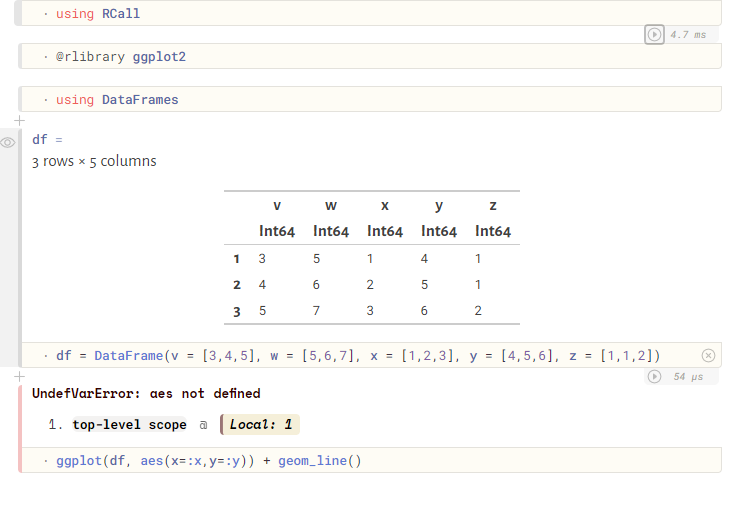 ggplot(df, aes(x=:x,y=:y)) + geom_line()现在,当我在pluto.jl笔记本中使用相同的代码(每行都是一个单独的单元格)时,我会得到以下错误消息: