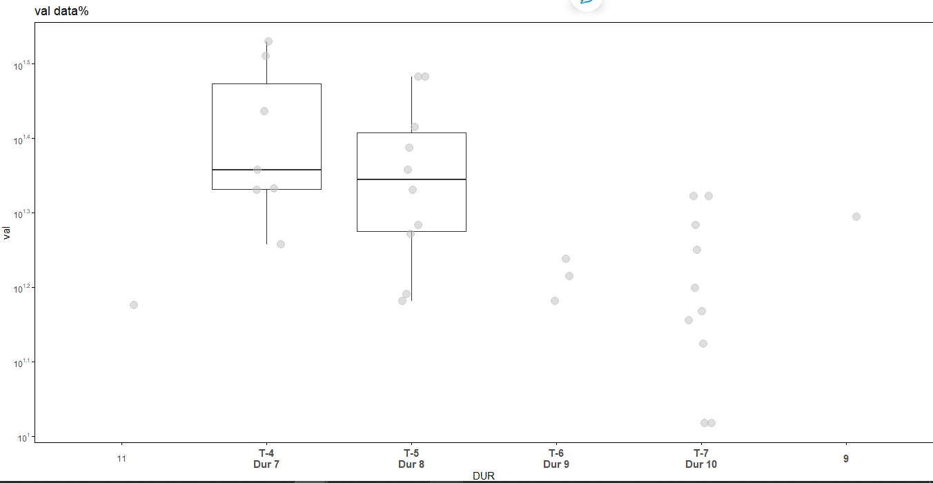 geom_jitter(data=subset(data_1, !is.na(DUR)),aes(x=DUR,y=val),position=position_jitter(width=.1, height=0),alpha=0.5,size=4,color='grey')+