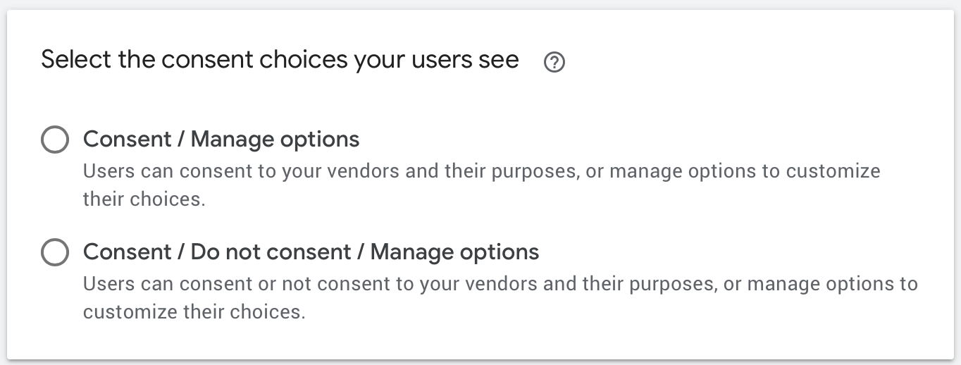 在UMP / FundingChoices后端生成欧盟( EU )同意消息时,首先要选择“选择用户看到的同意选择”,它由两个选项组成,参见屏幕截图: