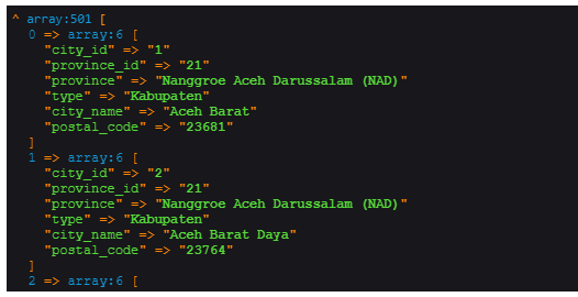 // THE OUTPUT IS ALL DATA FROM ARRAY WHICH THE city_name VALUE IS "Aceh Barat"我需要的是当$city = "Ace“时,它们将从city_name包含单词"Ace”的数组返回所有数据