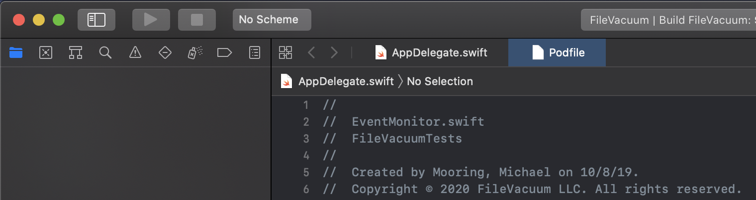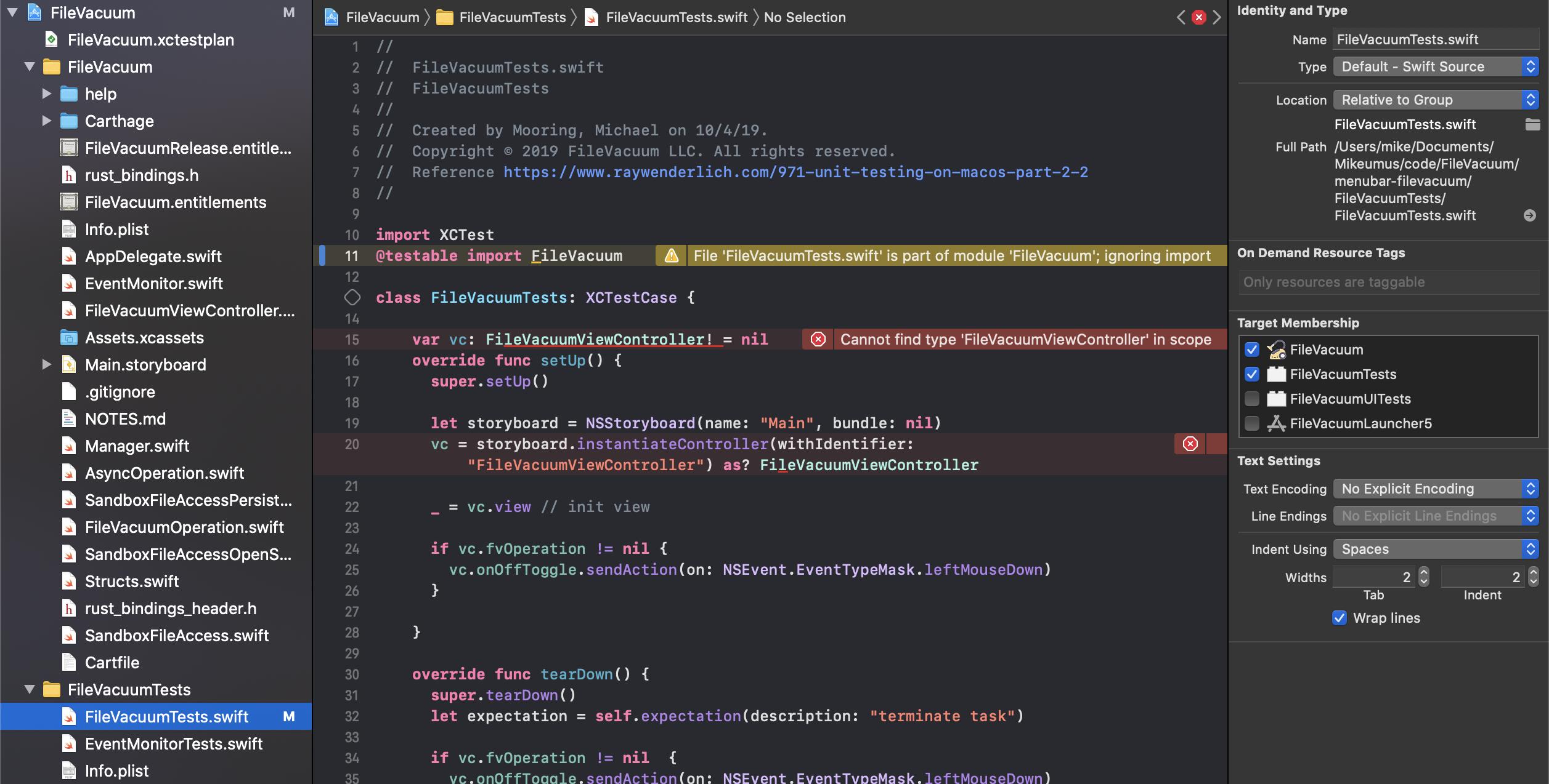 在Project中选择文件"FileVacuumViewController“,在”文件检查器“中,在”目标成员资格“一节中,检查以测试和UITests结尾的字段。如有必要,清理和建造项目。