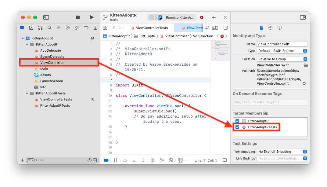 最近,我在XCode 13中遇到了这个问题,当时我在博客上写了一篇关于创建单元测试的文章。由于某些原因,XCode没有自动将ViewController添加到测试目标。