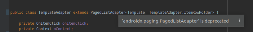 在我的android项目中,我使用了androidx分页库的alpha版本。它过去工作得很好,但是今天我的安卓工作室开始展示这个关于PagedListAdapter类的不推荐警告。我在谷歌上搜索,还查看了android开发者网站上的官方文档,但没有找到任何东西。