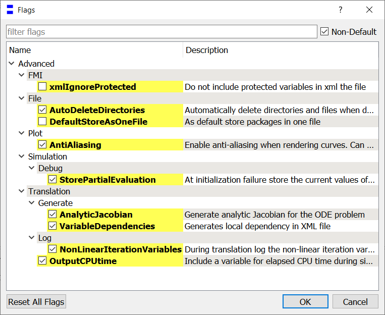 是否有命令从.mos脚本将所有Dymola标志重置为默认值?GUI有一个按钮来完成它,我基本上需要一个mos命令,该命令与左下角的“重置所有标志”按钮相同: