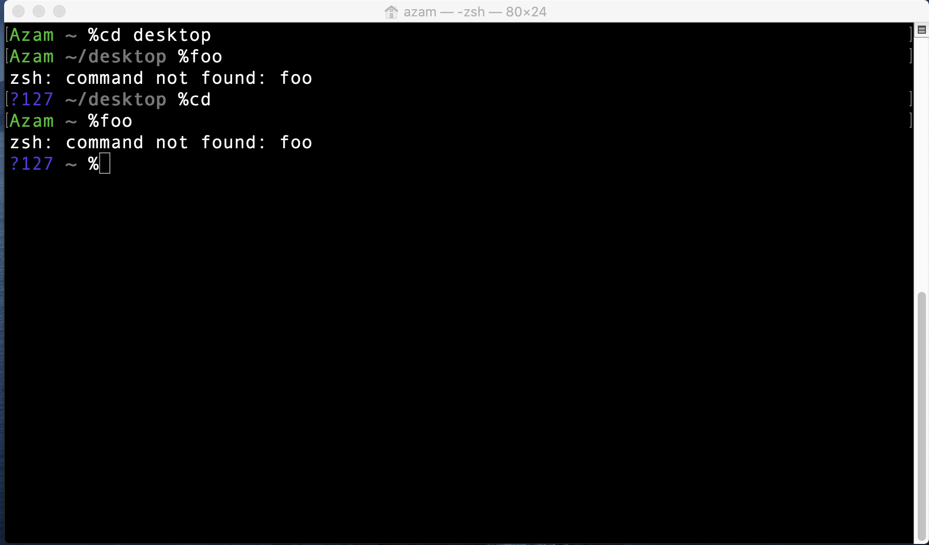 通过在主目录中创建一个新文件.zshrc并添加提示属性PROMPT='%(?.%F{green}Azam.%F{blue}?%?)%f %B%F{240}%0~%f%b %#',我成功地更改了提示符。现在我的提示符看起来很好,但是它的输出?127时command not found。请让我知道如何解决这个问题,这样它应该会回到默认提示符吗?