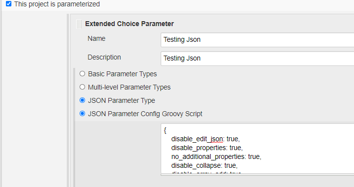 用下面的代码替换您的配置groovy脚本,它就能工作了。扩展选择参数的JSON参数特性是基于https://github.com/json-editor/json-editor的