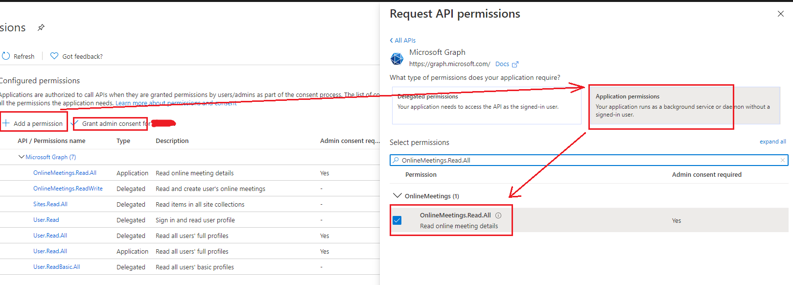 获取onlineMeeting需要应用程序权限OnlineMeetings.Read.All。
