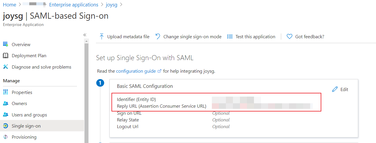 我想您正在使用SAML作为单点登录模式,如果是这样的话,只需导航到门户网站Azure Active Directory -> Enterprise applications -> All applications -> filter中的All applications并搜索您的应用程序,然后在应用程序-> Single sign-on中,Reply URL和Identifier是您想要检查的reply-url和identity-url。