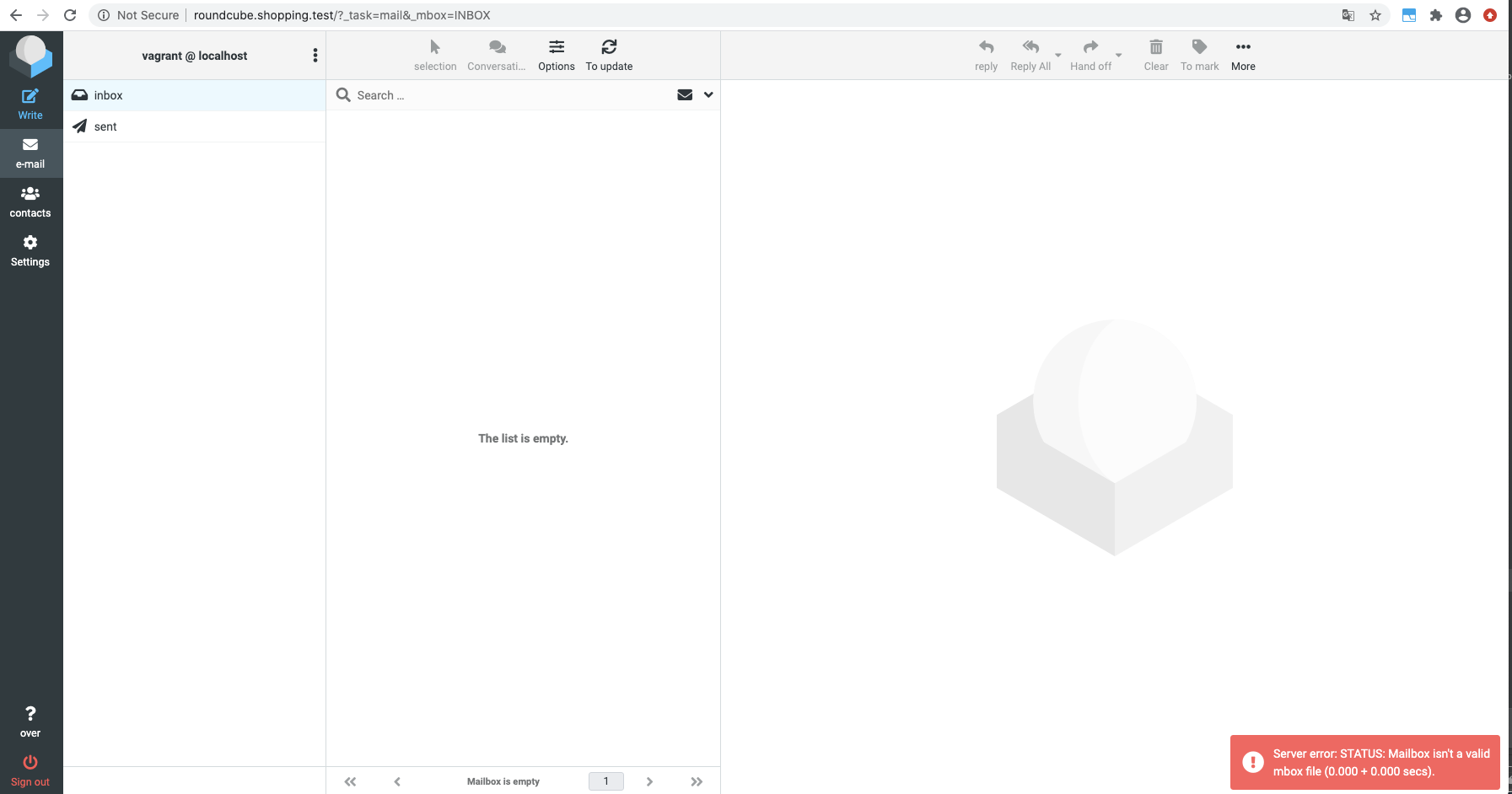当我从web浏览器登录到本地圆形立方体邮件客户端时,它会显示空的收件箱/发送文件夹,并带有错误消息。我使用php7.3、nginx、mysql作为本地技术栈。