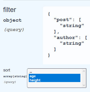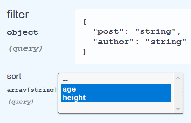 curl -X GET "https://editor.swagger.io/user?filter[post]=1,2&filter[author]=3,4&sort=age&sort=height" -H "accept: */*"您还可以通过以下方式定义filter参数
