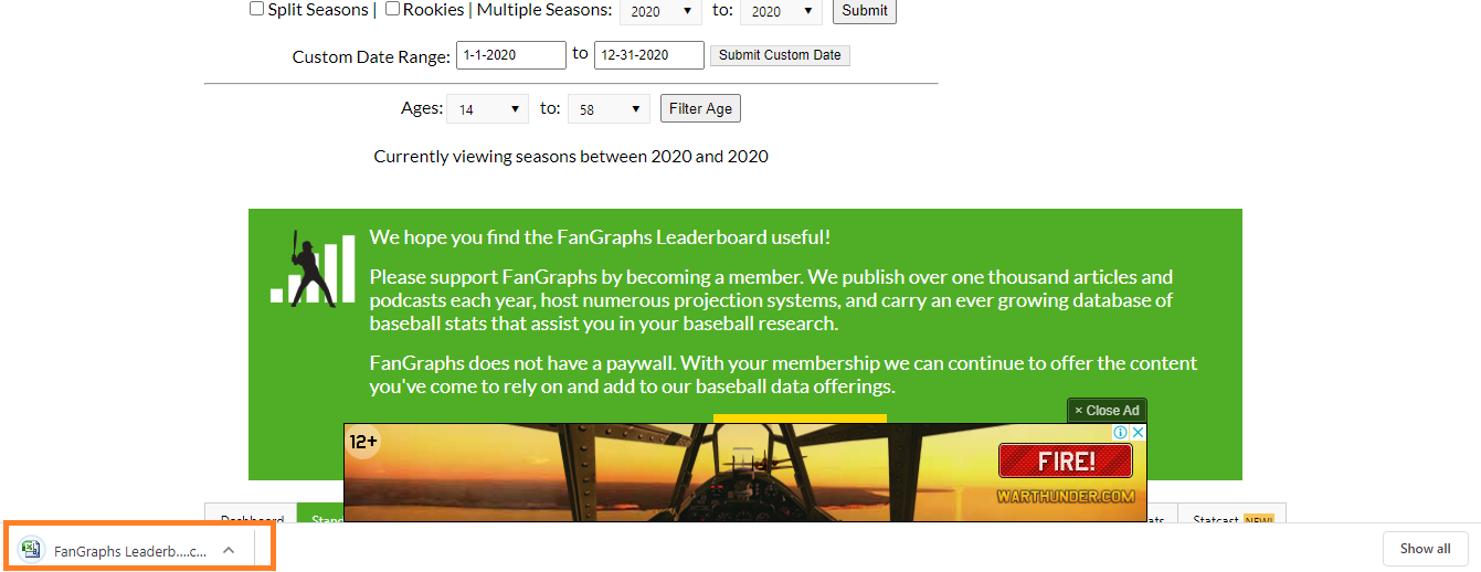 我想通过自动化下载一堆棒球统计数据的CSV文件,这些文件可以在:https://www.fangraphs.com/leaders.aspx?pos=all&stats=bat&lg=all&qual=0&type=0&season=2020&month=0&season1=2020&ind=0&team=0&rost=0&age=0&filter=&players=0&startdate=2020-01-01&enddate=2020-12-31上找到。将表作为CSV下载的按钮被标记为“Export”。