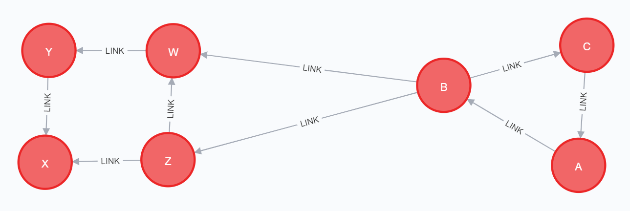 CREATE (a:User {name: "A", communityId: 2}), (b:User {name: "B", communityId: 2}), (c:User {name: "C", communityId: 2}), (x:User {name: "X", communityId: 1}), (y:User {name: "Y", communityId: 1}), (z:User {name: "Z", communityId: 1}), (w:User {name: "W", communityId: 1}), (a)-[:LINK {weight: 1}]->(b), (b)-[:LINK {weight: 1}]->(c), (c)-[:LINK {weight: 1}]->(a), (b)-[:LINK {weight: 1}]->(z), (z)-[:LINK {weight: 1}]->(x), (z)-[:LINK {weight: 1}]->(w), (w)-[:LINK {weight: 1}]->(y), (y)-[:LINK {weight: 1}]->(x), (b)-[:LINK {weight: 1}]->(w)