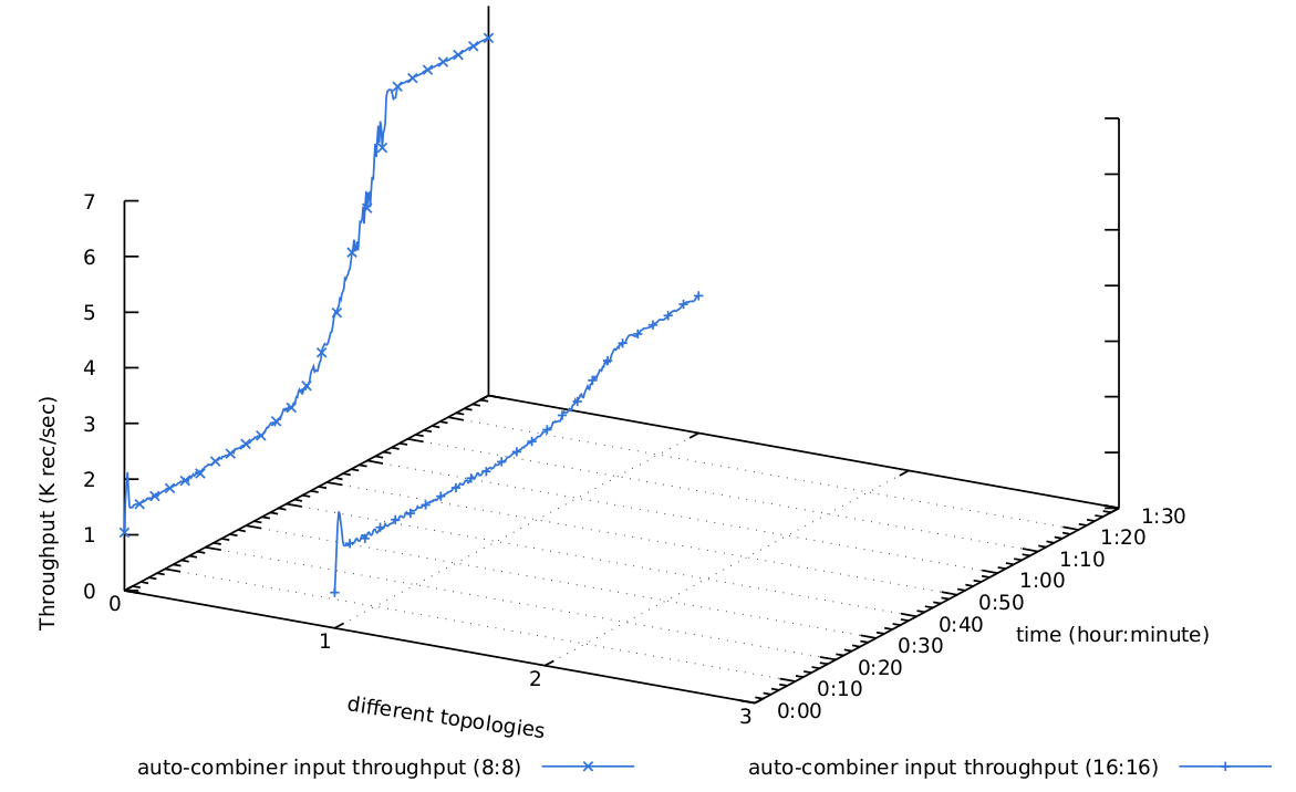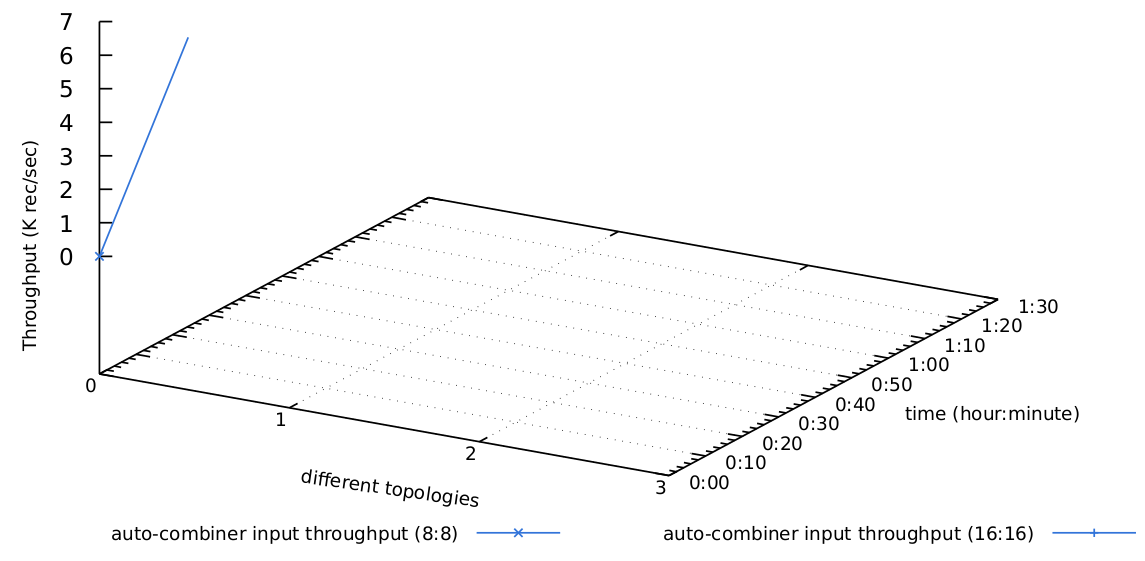 , t=0 "throughput-vs-networkbuffer-500K-16combiners-16reducers-all.csv" u x1:(column(2)/1000):(t==0?(t0=timecolumn(1,myTimeFmt),t=1):NaN, timecolumn(1,myTimeFmt)-t0) skip 2 title "auto-combiner input throughput (16:16)" with linespoints ls 9 \数据文件throughput-vs-networkbuffer-500K-8combiners-8reducers-all.csv