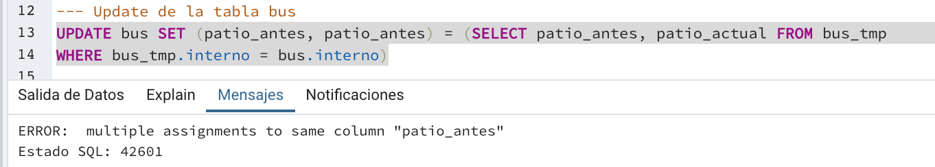 WHERE bus_tmp.interno = bus.interno)Error = ERROR:多个赋值给同一列"patio_antes“Estado SQL: 42601
