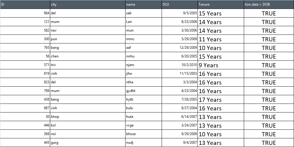 df$Tenure <- round(as.numeric(difftime(Sys.Date(),df$DOJ,units = 'weeks')/52.25),0)输出:
