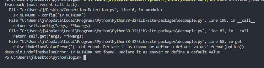 (‘IP_NETWORK’)文件第199行中,在call返回self.config(*args,**kwargs)文件"C:\Users\j\AppData\Local\Programs\Python\Python38-32\lib\site-packages\decouple.py",第83行中在call返回self.get(*args,**kwargs)文件第68行中,在get raise (‘{} not line )中。将其声明为envvar或定义默认值.‘..format(选项) decouple.UndefinedValueError: IP_NETWORK not。将其声明为envvar或定义默认值。PS C:\Users\j\Desktop\python\login>