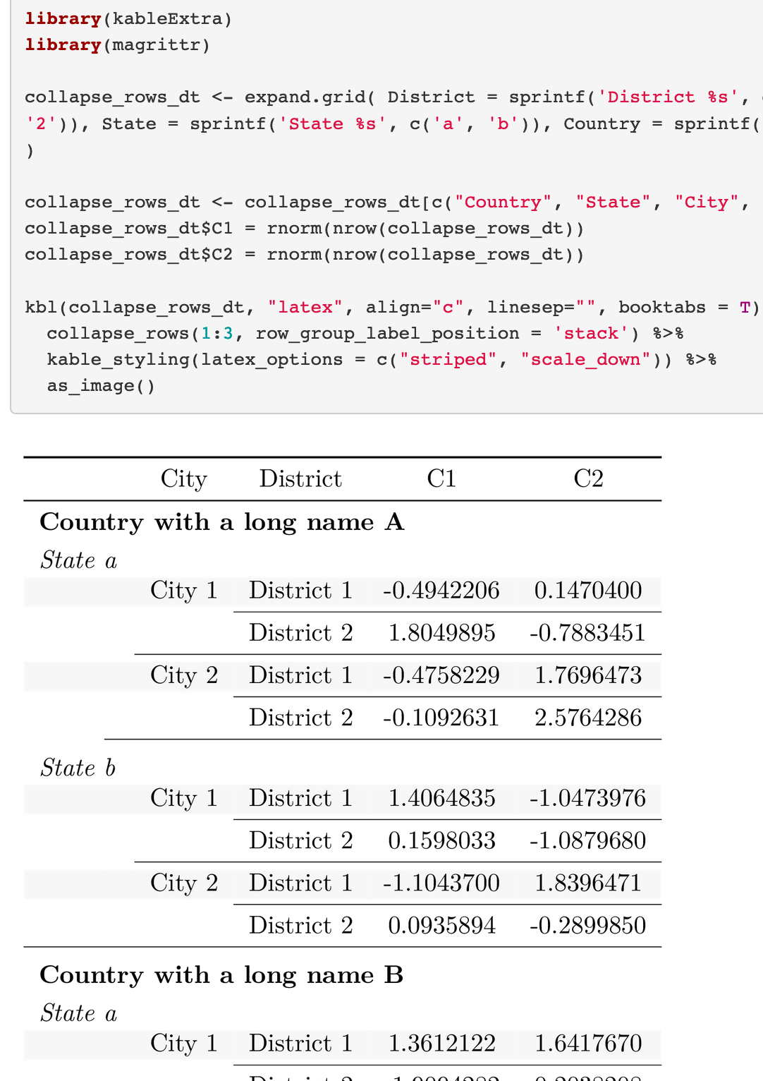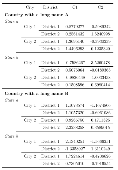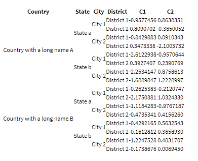 collapse_rows_dt <- expand.grid( District = sprintf('District %s', c('1', '2')), City = sprintf('City %s', c('1', '2')), State = sprintf('State %s', c('a', 'b')), Country = sprintf('Country with a long name %s', c('A', 'B'))