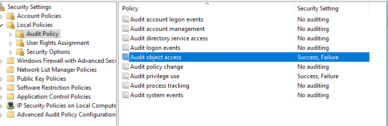 请转到本地政策->审核政策。启用“审核对象访问”以确保成功和失败。