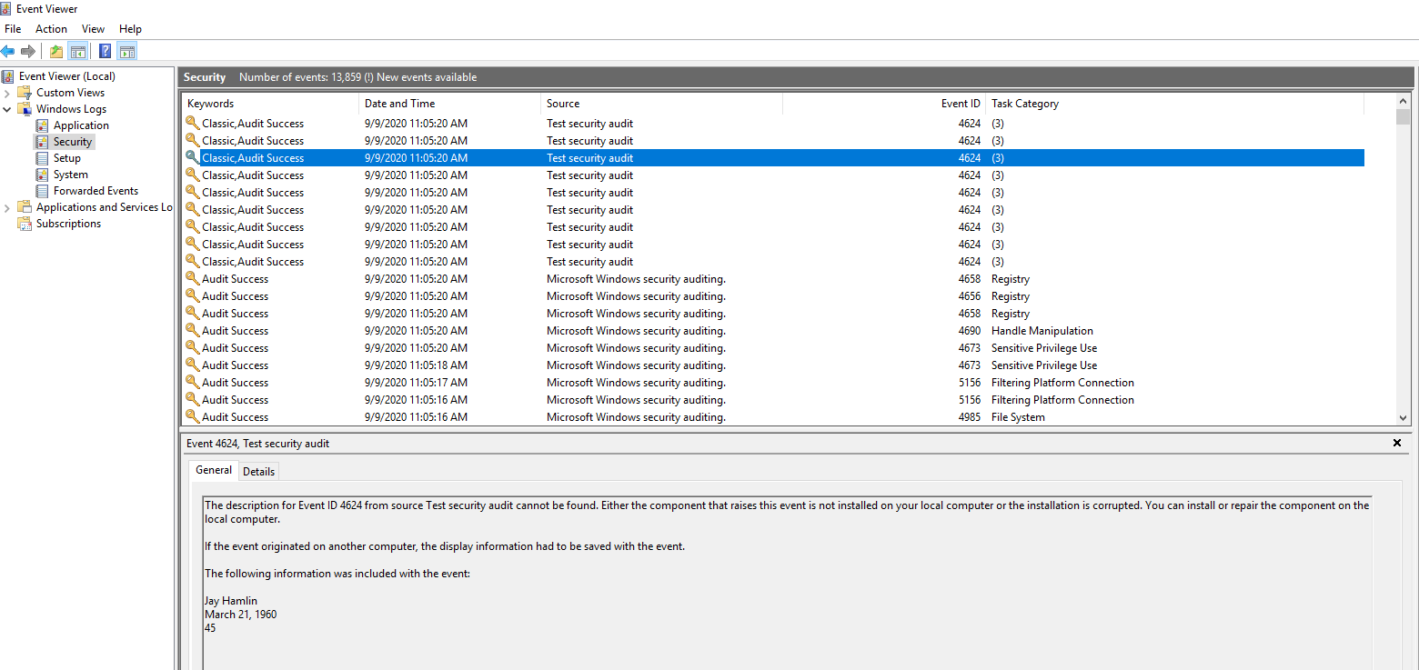+ Write-EventLog -LogName Security -Source "Microsoft-Windows-Security-Auditing" - ...