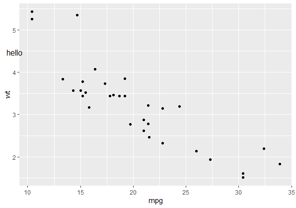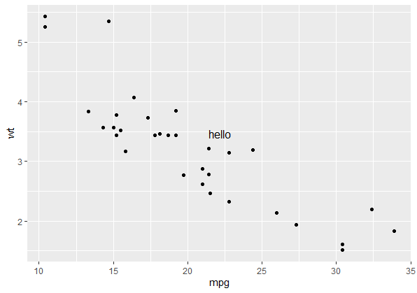 p + annotate("text", x = 30, y = 4.5, label = "hello")我希望达到同样的效果,但我不想在本机坐标中指定x和y,而是用npc坐标指定它们。就本例而言,我并不担心将x = 30和y = 4.5准确地转换为npc单元。我只想知道npc单元是否可以在annotate()中使用。