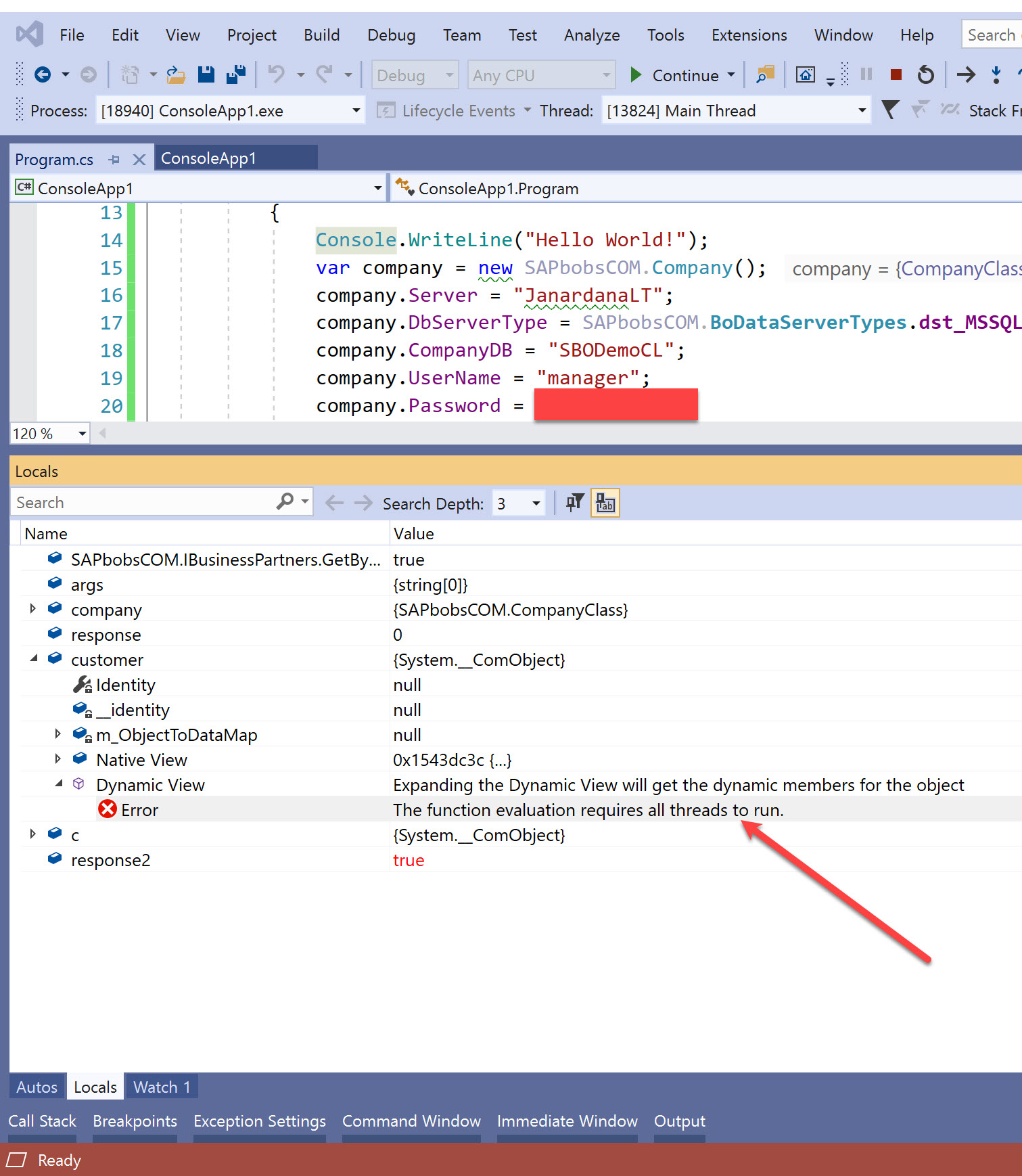我引用了SapBusinessOneSDK.dll在.Net核心控制台应用程序中,通过DI API访问SAP B1,并且在调试时无法检查任何Sap B1 COM对象。出现的错误是: