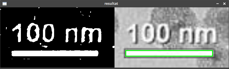 我有大量的图片,如下所示。我正在尝试从透射电子显微镜图像中检测纳米粒子,这是我使用OpenCV成功实现的。该图像只是一个较大的透射电子显微镜图像左下角的作物。我想提取'100 nm‘下白色彩色线段的长度。目前,我是手动测量这条线的长度,我想自动化这一点。我认为这可以用OpenCV通过轮廓来完成,但是我还有很多其他的功能,这些特性在图像中也有轮廓。我对Python很陌生,我不太确定如何实现它,或者这一点是否可以实现。我对代码应该做什么的想法: