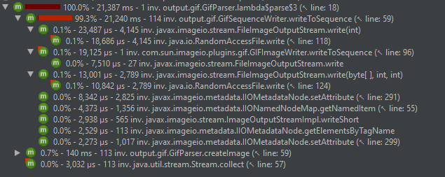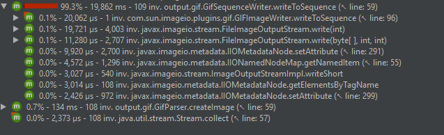 在您的示例中,大部分时间直接用于GifSequenceWriter.writeToSequence方法。