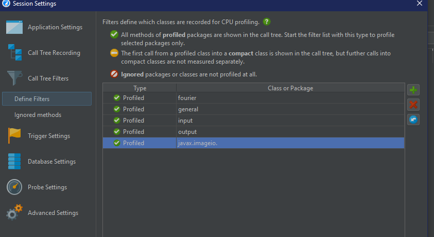 在这种情况下,另一个相关的主题是,JProfiler有一个调用树过滤器的概念。如果一个类是未配置的,并且仍然显示在树中(因为它是由一个profiled类直接调用的,还是因为它位于树的顶层),那么由于对其他未描述的方法的调用,它可以有大量的自定义时间。对于您的GifSequenceWriter类来说不是这样,但是下面的GifImageWriter类是这样的。您可以通过方法图标左上角的红色角识别未配置的类。