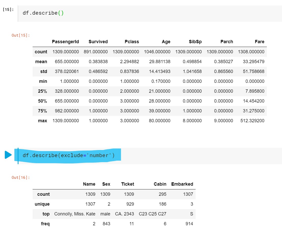 我只是看看泰坦尼克号的Kaggle竞赛,发现.describe()函数中的这个参数很有趣。我拍了一个(用蓝色高亮显示)。这是笔记本的链接。