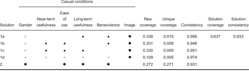 我使用R.中的QCA包做了fsqca分析,我有精巧的,中间的解决方案,可信的。我想生成一个解决方案表,如下所示: