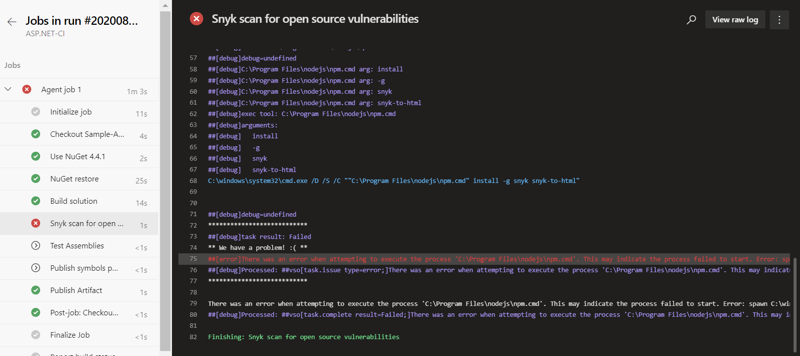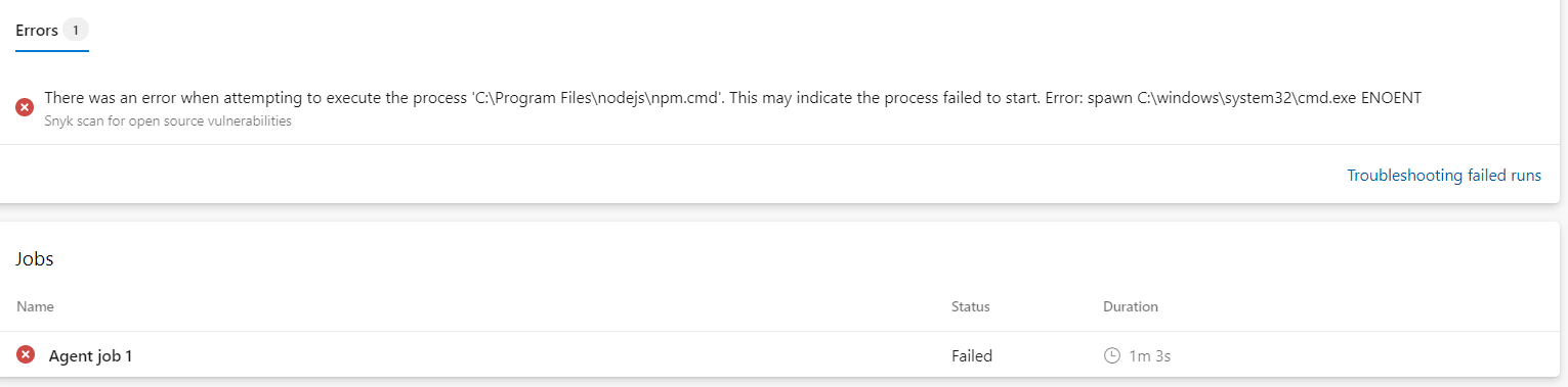 我试图使用Snyk安全扫描任务在Azure管道(经典)。我的应用程序运行时是.Net,框架是ASP.Net 4.4.1。在身份验证方面没有问题,因为我已经创建了Snyk的有效服务连接。