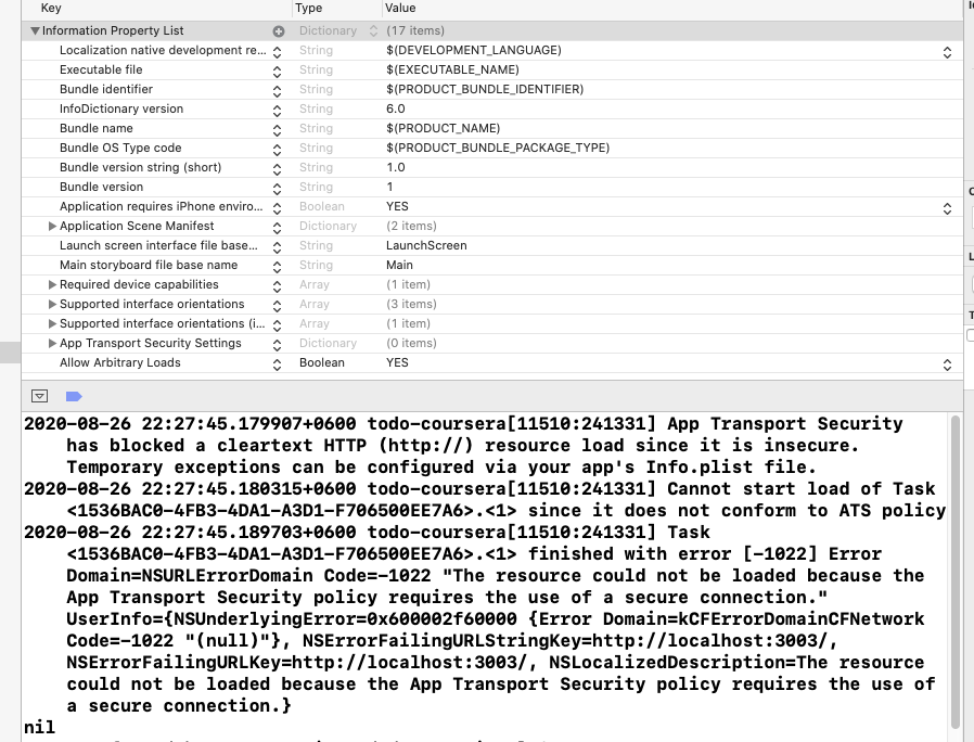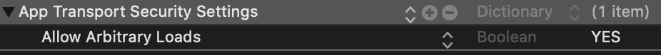 您应该在Allow Arbitrary Loads字典中添加App Transport Security Settings,如下所示:
