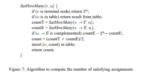 同时,在他的部分(b)建议中,@DCTLib发布了一个指向https://github.com/VerifiableRobotics/slugs/blob/master/src/BFAbstractionLibrary/BFCudd.cpp的链接。我一直在试着读这个节目。在经典的Somenzi论文中有一个递归函数,即二进制决策图,它描述了计算满意分配数的算法(图7)。我一直在尝试比较这两种动物,鼻涕虫和图7,但是很难看到相似之处。但对我来说,C是最难以理解的。你知道鼻涕虫BFCudd是否基于索梅泽图7 @DCTLib吗?