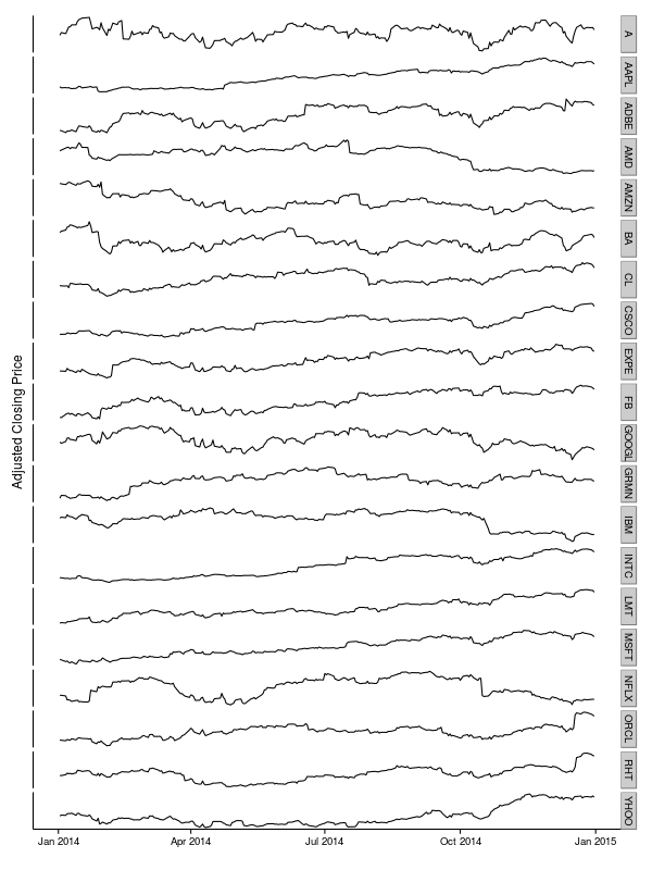 stocksDf <- do.call(rbind,stocks)最后,我们使用qplot()和Date和Close作为x和y变量,使用facet_grid()和Symbol生成方面。
