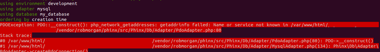 #0 /var/www/html/ /vendor/robmorgan/phinx/src/Phinx/Db/Adapter/PdoAdapter.php(80): PDO->__construct()这意味着phinx没有识别码头配置。