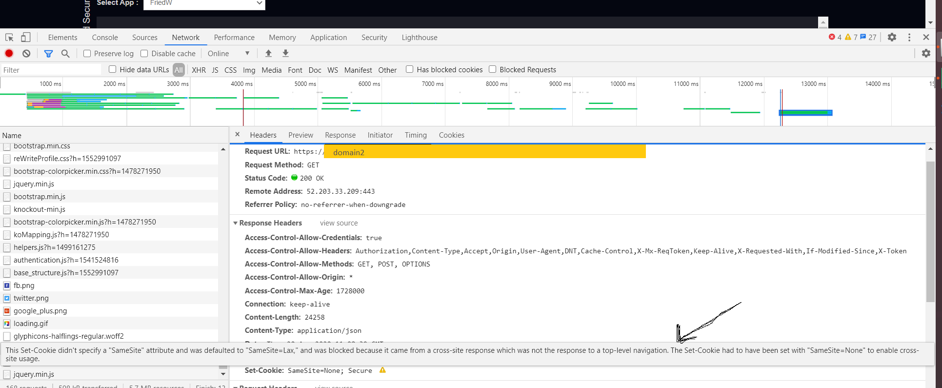 }当我尝试第二种解决方案时,头似乎是从chrome上的响应中接收到的,但是chrome给出了以下警告: