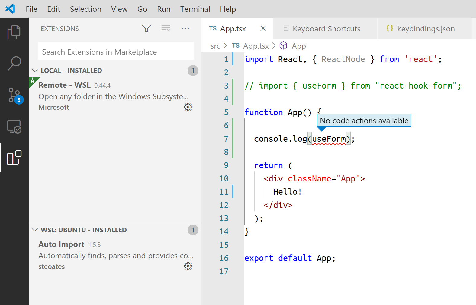 我试着让它在两台PC机和一台Mac电脑上工作--结果是一样的:当我输入时没有导入建议,当我专注于符号并按下Ctrl+./Cmd+.时没有选项--没有快速修复建议。