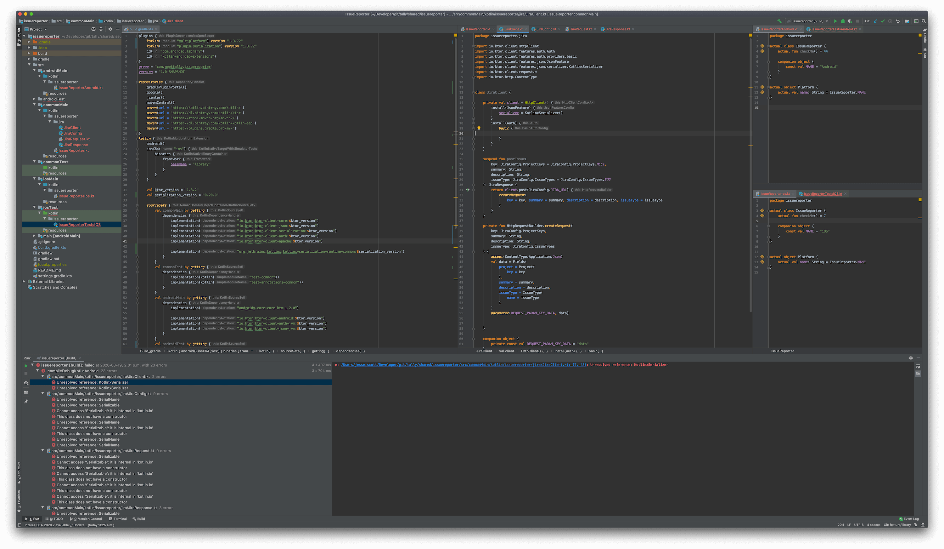 首先,在几个教程之后,我做了一个共享项目,iOS的导入运行良好,但安卓的Ktor实现无法解决。然后我意识到我需要重新创建这个项目,创建一个库而不是一个共享的应用程序,因为我已经为每个移动客户端建立了现有的代码库,并且我需要发布供他们使用的MPP库。