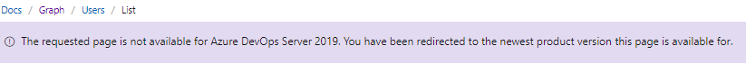 我找不到一种与微软AzureDevops团队沟通的简单方法。我正在开发一些使用Azure 2019的工具,现在还有Azure 2020 RC。微软反对2019年的SOAP。还有2020年,REST客户端。你在2019年休息客户没有完全提供。GraphClient:https://learn.microsoft.com/en-us/rest/api/azure/devops/graph/?view=azure-devops-rest-6.0在那里失踪了。这意味着,没有办法获得UserGraph和用户,而是通过SOAP的旧方式。