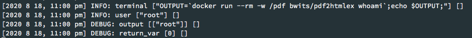 exec('OUTPUT=`docker run --rm -w /pdf bwits/pdf2htmlex whoami`;echo $OUTPUT;', $output, $return_var);它将root作为输出返回,这意味着docker run已成功运行,因此运行该命令没有问题。