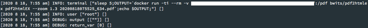 exec('OUTPUT=`docker run -ti --rm -v /server-path:/pdf bwits/pdf2htmlex pdf2htmlEX --zoom 1.3 20200818075525_634.pdf`;echo $OUTPUT;', $output, $return_var);致: