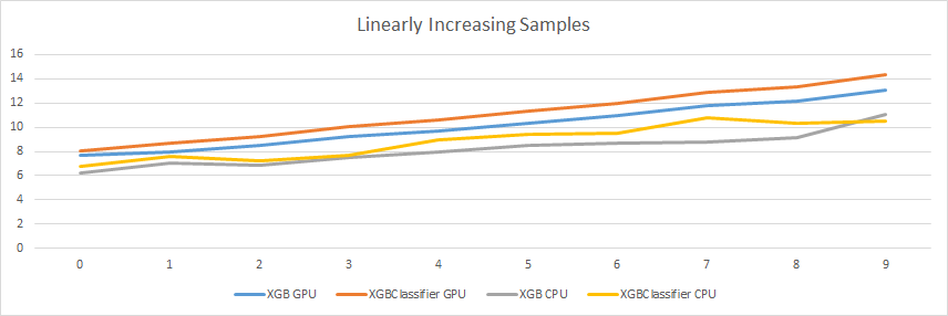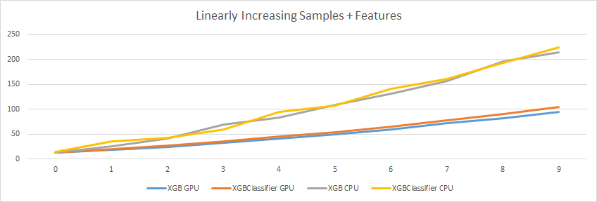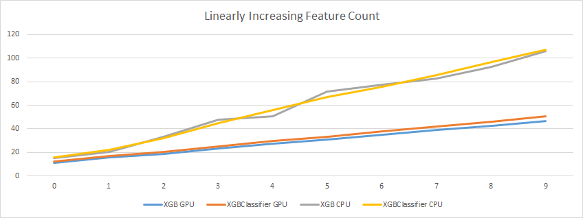 当我开始做更多的研究时,这是有意义的。众所周知,GPU具有很好的高维数据扩展能力,如果您的数据是高维,您将看到训练时间的改进。见以下示例: