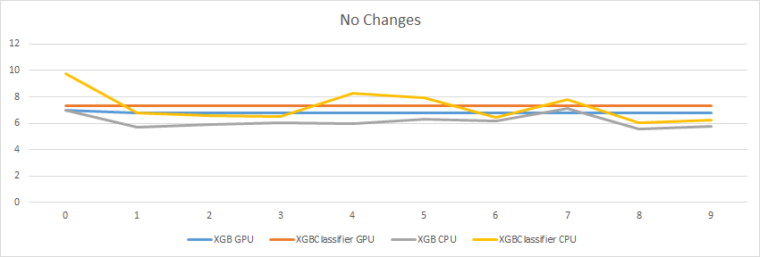 df = pd.DataFrame({'XGB GPU': xgb_gpu, 'XGBClassifier GPU': xgbclassifier_gpu, 'XGB CPU': xgb_cpu, 'XGBClassifier CPU': xgbclassifier_cpu})
