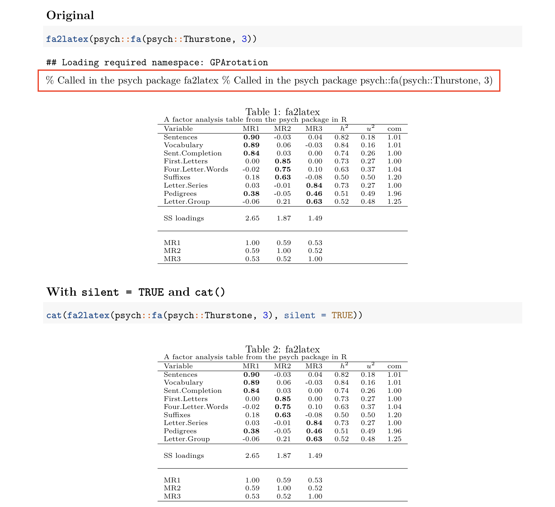 我在RMarkdown文档中包含了来自psych包的因素分析结果。使用fa2latex()在psychTools包中打印因子加载表。R代码如下所示:
