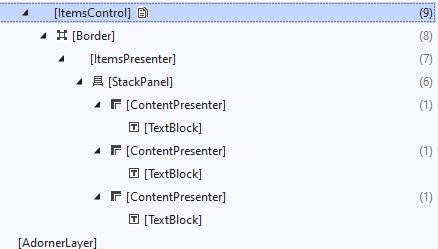 </ItemsControl.ItemContainerStyle>这有点道理,因为根据前面显示的可视树,每个项的根节点实际上是ContentPresenter。
