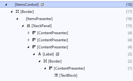 这个可视化树并不奇怪,我们只是替换了以前是TextBlock的默认表示形式。在它的位置,我们现在找到了一个标签与它自己的标准子树。