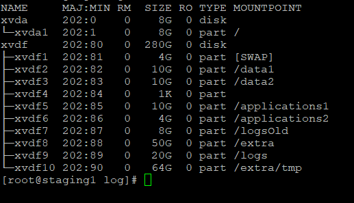 NAME MAJ:MIN RM SIZE RO TYPE MOUNTPOINTxvda 202:0 0 8G 0磁盘xvda 1 202:1 0 8G 0部分/ xvdf 202:80 0 280 g 0磁盘xvdf 1 202:81 0 0 4G 0部件交换区├─xvdf 2 202:82 0 0 10 G 0部分/data2├─xvdf 3 202:83 0 10 G 0 part /data2├─xvdf 4 202:84 0 1K 0 part├─xvdf 5 202:85 0 10G 0 part /applications1├─xvdf 6 202:86 0 4G 0 part /applications2├─xvdf 7/logsOld├─xvdf9 8 202:88 0 50G 0 /extra├─xvdf9 9 202:89 0 20 g 0 part /logs└─xvdf9 10 202:90 0 64G 0部分/额外/tmp
