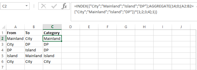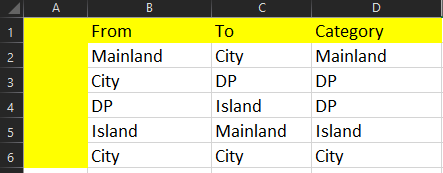 它的两列(“从”和“到”)充满了“大陆”、“岛屿”、“城市”和"DP“,形成了上面所示的随机组合。我需要一种方式来显示在“类别”列中,在每一行中,这个词比其他单词优越,遵循城市<大陆<岛< DP原则。例如岛在城市之上,所以在这2种组合中,类别显示“岛”。